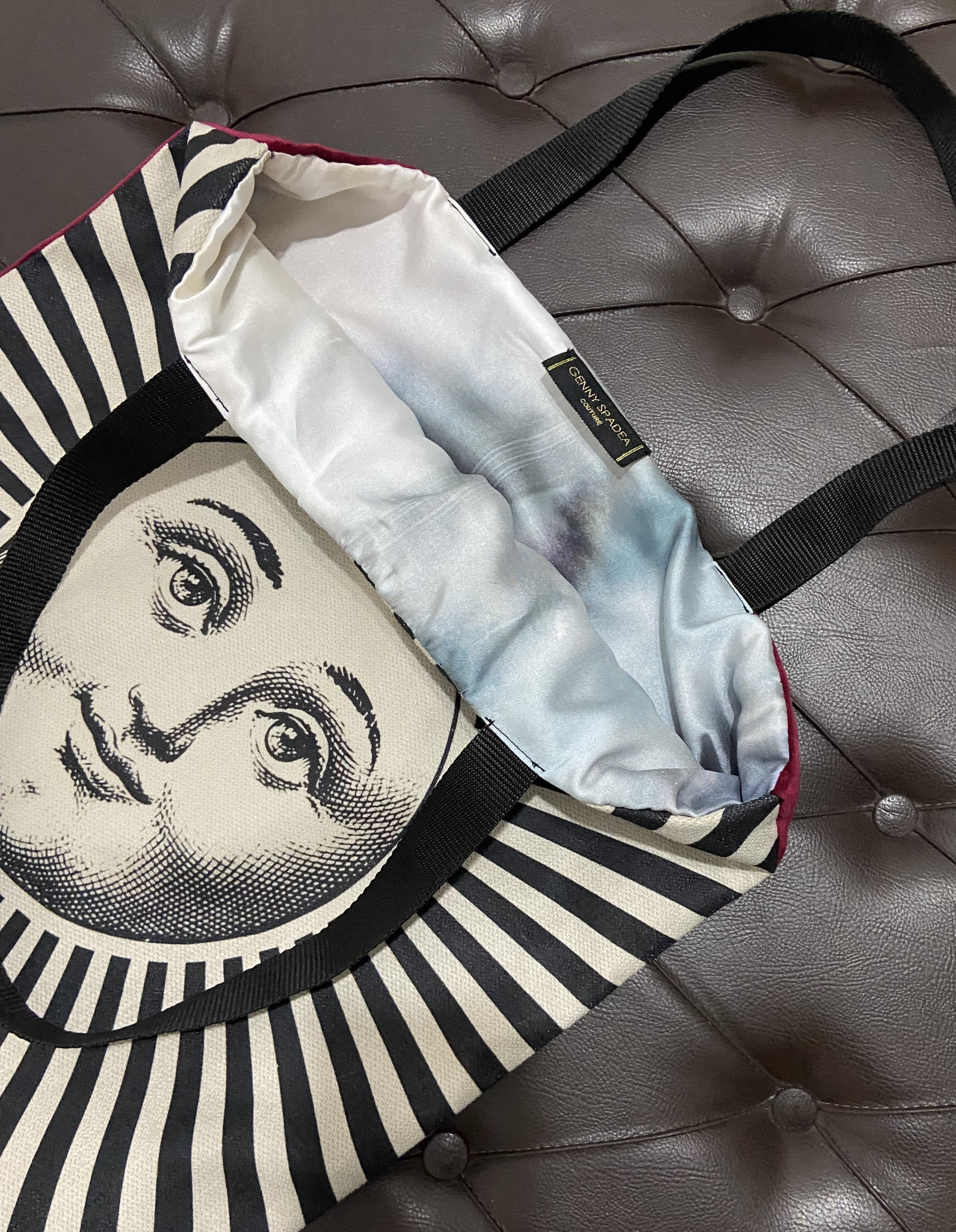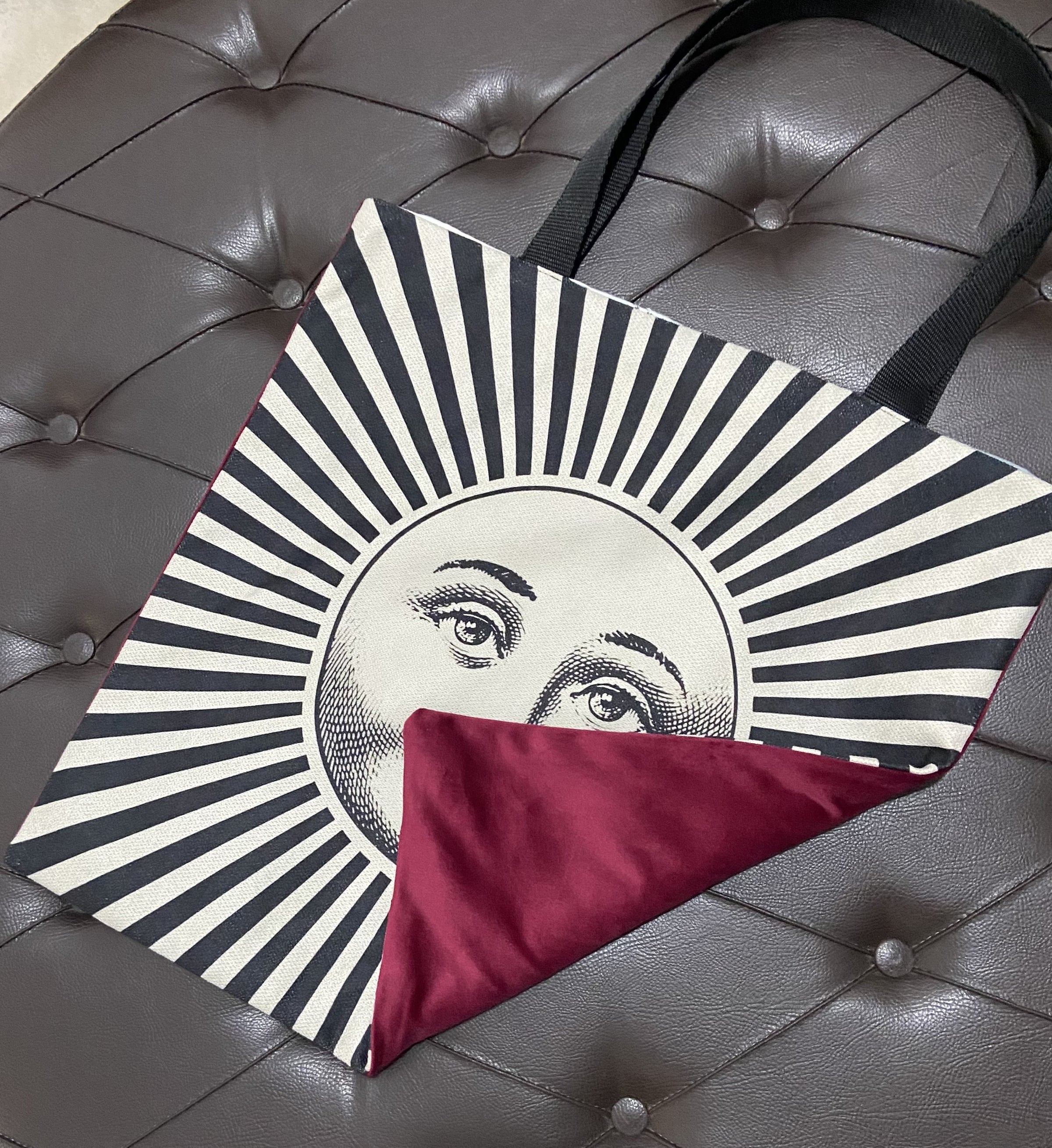 • Esterno in tessuto  con stampa artistica e velluto bordeaux tinta unita